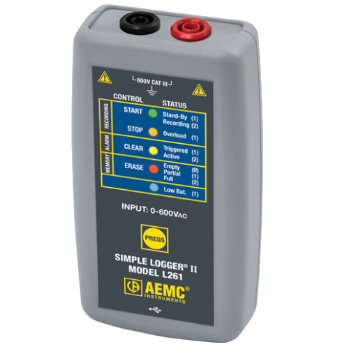 The AEMC Simple Logger II Model L261 is a single-channel recording device powered by an alkaline battery pack. Line tracking is performed such that 64 samples over one line cycle are taken. Frequency tracking is performed over the range of ±2Hz around the nominal line frequency (50 or 60Hz). Harmonic measurements are calculated from these 64 samples (Harmonics are only available from the Simple Logger II Control Panel within the DataView software).The Simple Logger II records TRMS at a rate of up to eight times per second. The measurement process is performed no more than eight times per second. TRMS calculations are performed on a single line cycle. This means that the input(s) are ignored between measurement intervals. The main advantage of the logger is its ability to perform a variety of recording tasks with easy and intuitive setup from a computer using DataView software.Analog information on the input is sampled and converted to a digital signal. This digital signal is processed and stored along with scale and time information. An optically isolated Universal Serial Bus (USB) port provides for the transfer of data from the instruments internal memory to the computer for analysis.