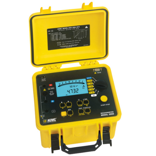 The AEMC Digital/Analog Megohmmeter Model 5060 is the latest design in 5000V insulation testers. Features include automatic calculation and presentation of the Dielectric Absorption Ratio (DAR), Polarization Index (PI) and Dielectric Discharge (DD). The Model 5060 displays the test voltage, insulation resistance and the leakage current during the test. Capacitance of the sample and discharge voltage present at the test leads is displayed at the conclusion of the test. This meter is designed with the highest level of built in safety features. The Model 5060 can be operated from an internal rechargeable battery system or from an AC line power.The Model 5060 offers additional functionality in that an RS-232 port provides the ability to configure the unit from a PC and run the test from the PC. Test reports can be generated directly from the instruments to a printer or through the PC using the DataView® graphing and analysis software.