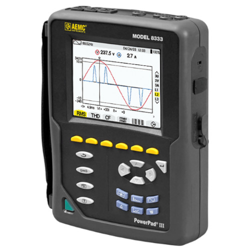 The AEMC PowerPad® III Model 8333 is a three-phase power quality analyzer that is easy-to-use, compact and shock resistant. It enables technicians and engineers to measure and carry out diagnostics and power quality work on single- or three-phase networks. Three current and four voltage input terminals are provided and the unit is IEC 61000-4-30 Class B and safety rated to 600V CAT IV.
