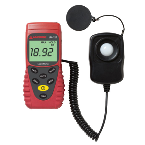 The Amprobe Instruments LM-120 light meter measures the visible light from fluorescent, metal halide, high-pressure sodium or incandescent sources. It is a portable, easy-to-use digital light meter designed for simple one-hand operation reading in Lumen (lux) or foot candle (fc) units. The LM-120 measures a wide range of light up to 20,000 fc or 200,000 lux with an accurate, high resolution of .01 fc/lux. The LM-120 is auto-ranging plus manual ranging with the ability to zero out the reading before taking a measurement.