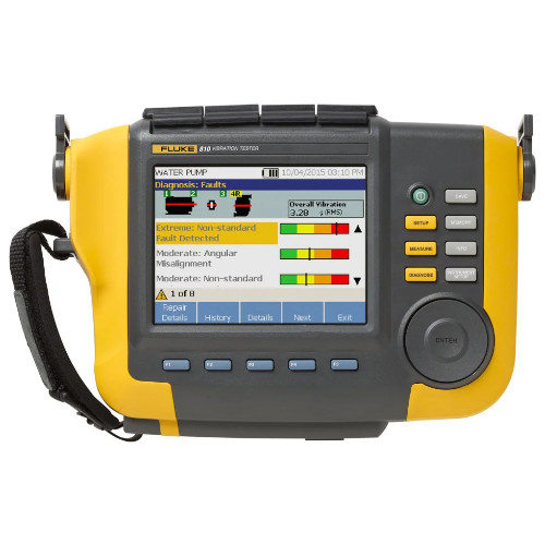 The Fluke Electronics model 810 is a Handheld Vibration Tester which allows you to control unplanned downtime, prevent recurring problems, set repair priorities and manage your resources with an entirely new approach to vibration testing. The Fluke 810 is the most advanced troubleshooting tool for mechanical maintenance teams who need an answer now. The unique diagnostic technology helps you quickly identify and prioritize mechanical problems, putting the expertise of a vibration analyst in your hands.