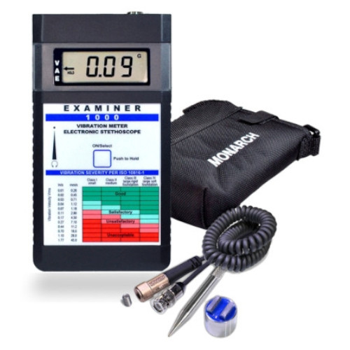 The Monarch Instruments EXAMINER 1000 is a handheld vibration meter designed to be used with vibration limits established in ISO Standard 10816 to help you detect signs of malfunction or changes in rotating machinery during operation. This is accomplished with overall vibration (ISO VIB) and envelope measurements. Problems with bearings occur when there is a microscopic crack or flaw or when there is a breakdown in lubrication which leads to metal-to-metal interaction. The EXAMINER 1000 is designed to detect flaws or a lack of lubrication in bearings and gears at an early stage by measuring the high-frequency impacts through acceleration envelope methods. Vibration measurements are made by pressing the accelerometer sensor against designated measurement points on your equipment with either the stringer probe or with the magnetic base.