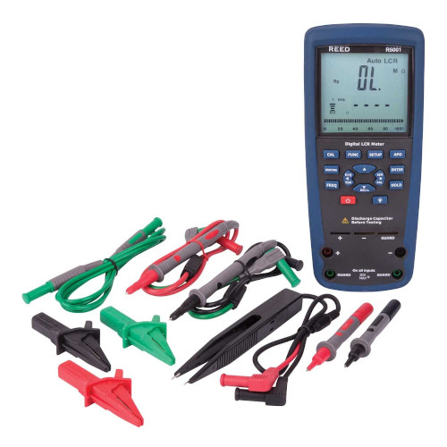 The Reed Instruments R5001 LCR meter measures inductance, capacitance and resistance with secondary parameters such as dissipation factor (D), quality factor (Q), phase angle (Ø) and equivalent series/parallel resistance (ESR or Rp). The R5001 features an easy-to-read LCD display with backlight, and data hold/relative functions.