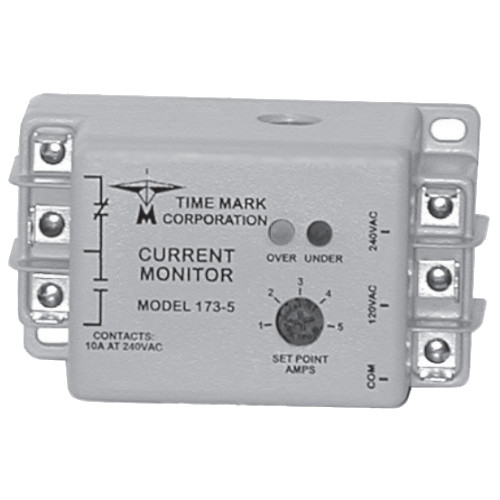 The Time Mark Model 173 AC Current Monitor is a single set-point current monitor. It can be used to detect either over current or under current, depending on whether the trip point is set above or below the input current. An LED indicator illuminates whenever the current is above the set-point. Two versions, either of which can be connected to 120 or 240 VAC, are available. One for current ranges up to 5 amps (Model 173-5), the other for applications from 5 to 25 amps (Model 173-25). For currents above 25 amps, matching CTs are available.