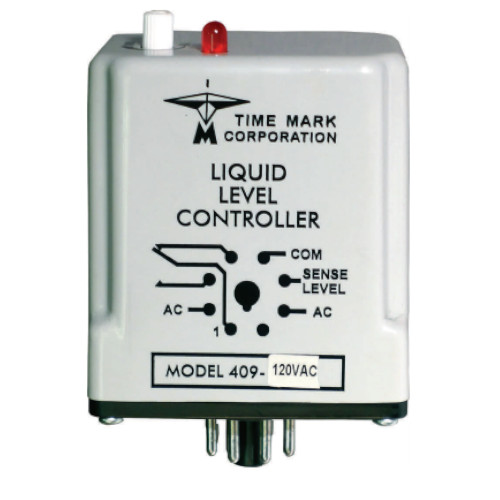 The Time Mark Model 409 is a compact, socket-mount device for level control of conductive liquids. The internal relay is energized when operating power is applied. When the liquid level reaches the probe, the relay de-energizes. When the level drops below the probe, the relay will reset.