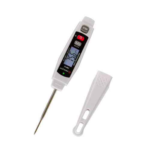 The Triplett TMP15 Stem Thermometer has a 2.5” (63.5mm) food grade stainless steel probe with thin 0.08mm diameter tip for measuring the temperature of liquids and semi-solids. It has a 1 second sample rate, temperature range of -58 to 572°F (-50 to 300°C) with 0.1°F/°C resolution and a basic accuracy of ±1.8°F /1°C. A built-in LED alarm light turns red when temperature exceeds 212°F/100°C, and green when temperature is lower than 32°F/0°C. It features Min/Max and a Data Hold function that freezes the reading on the backlit display. Comes complete with an CR2032 battery and protective probe cover.